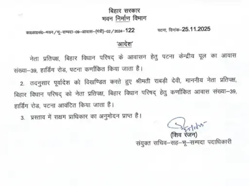 बिल्डिंग कंस्ट्रक्शन डिपार्टमेंट की ओर से जारी ऑर्डर में कहा गया है कि पटना सेंट्रल ब्रिज स्थित हार्डिंग रोड नंबर 39 का मकान बिहार लेजिस्लेटिव काउंसिल के लिए अलॉट किया गया है। अब राबड़ी देवी को 10 सर्कुलर रोड स्थित आवास खाली करना होगा।